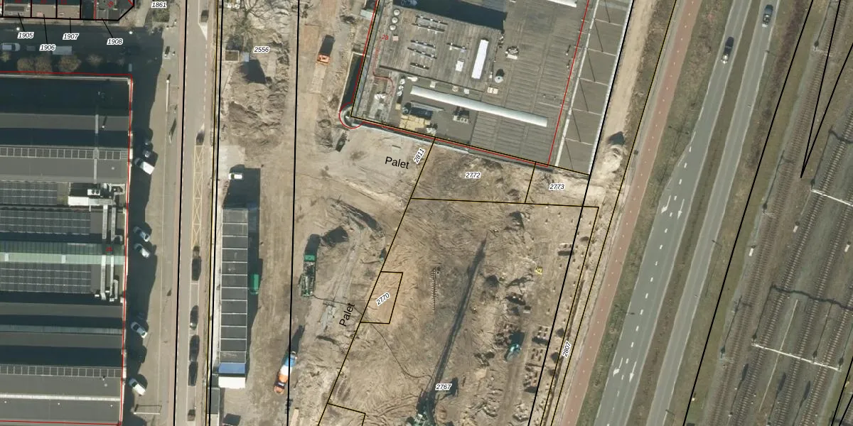 Het perceel waarop Palet 464 staat heeft een oppervlakte van 3690 m². Dit is een zeer groot perceel. De perceeloppervlakte wordt geregistreerd door het Kadaster. Gedetailleerde informatie over de maten van dit perceel kunt u vinden in het rapport Kadastrale kaart met maatvoering van Palet 464.