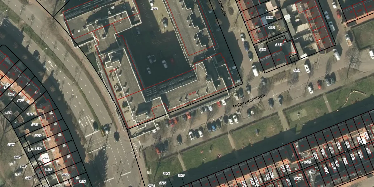 Het perceel waarop Palmboomstraat 50 staat heeft een oppervlakte van 6384 m². Dit is een zeer groot perceel. De perceeloppervlakte wordt geregistreerd door het Kadaster. Gedetailleerde informatie over de maten van dit perceel kunt u vinden in het rapport Kadastrale kaart met maatvoering van Palmboomstraat 50.