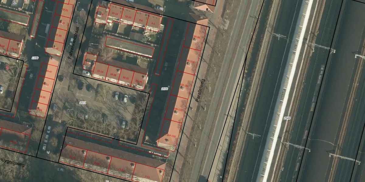 Parallelweg 105 is gelegen op kadastraal perceel HTG00F2070. Deze kadastrale aanduiding is uniek en wordt gebruikt door het Kadaster om eigendomsrechten en andere zakelijke rechten vast te leggen. Het perceel maakt onderdeel uit van de kadastrale gemeente 's-Hertogenbosch.