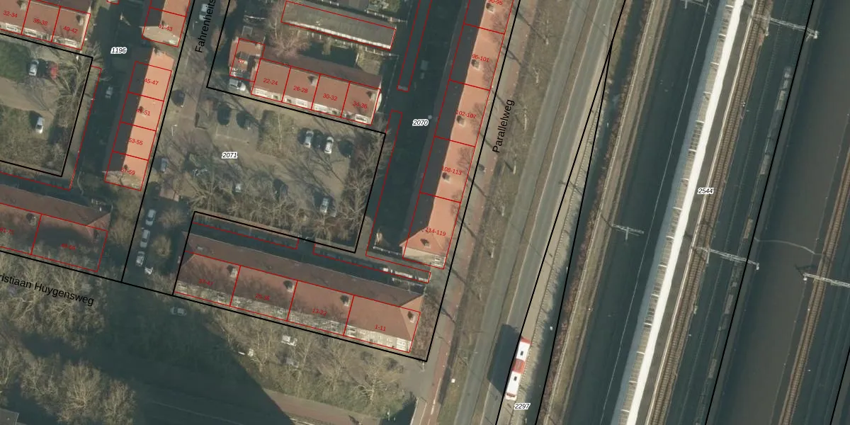 Parallelweg 118 is gelegen op kadastraal perceel HTG00F2070. Deze kadastrale aanduiding is uniek en wordt gebruikt door het Kadaster om eigendomsrechten en andere zakelijke rechten vast te leggen. Het perceel maakt onderdeel uit van de kadastrale gemeente 's-Hertogenbosch.