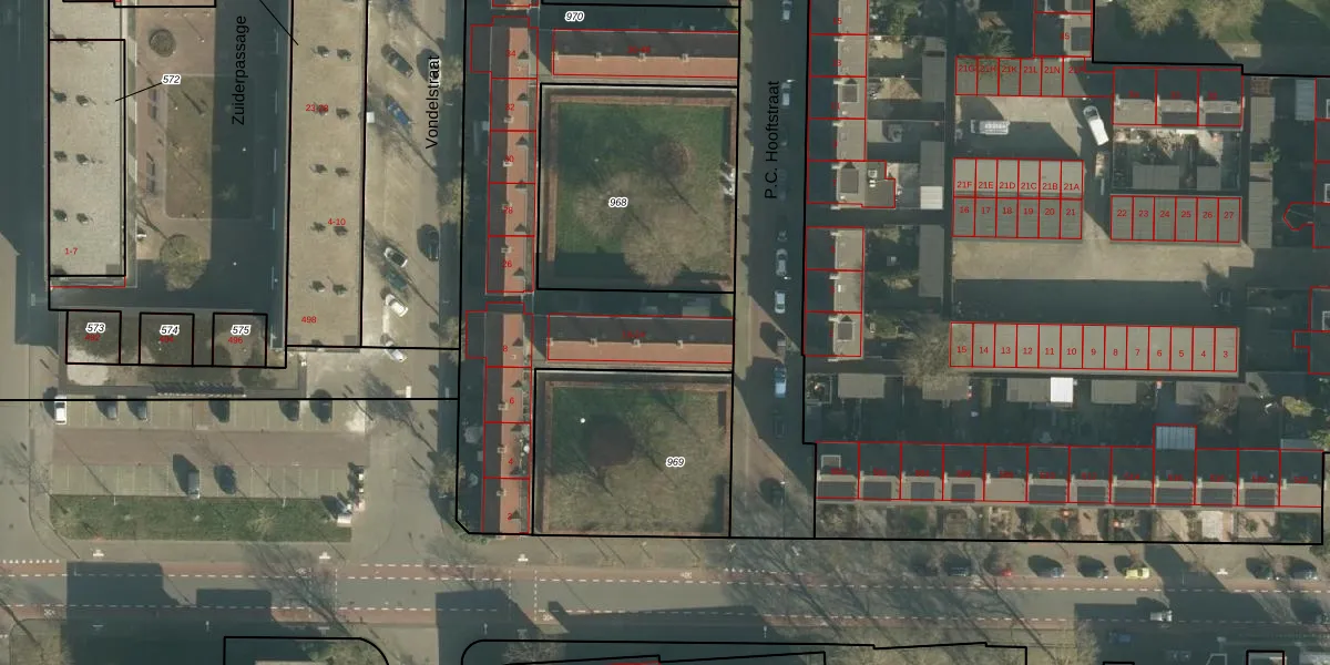 Het perceel waarop P.C. Hooftstraat 22 staat heeft een oppervlakte van 3235 m². Dit is een zeer groot perceel. De perceeloppervlakte wordt geregistreerd door het Kadaster. Gedetailleerde informatie over de maten van dit perceel kunt u vinden in het rapport Kadastrale kaart met maatvoering van P.C. Hooftstraat 22.