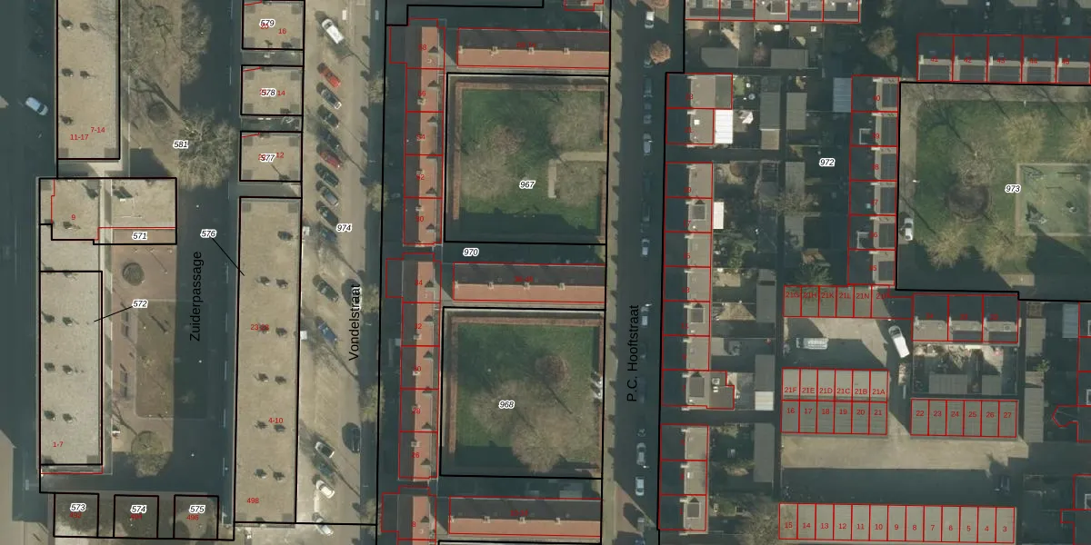 Het perceel waarop P.C. Hooftstraat 44 staat heeft een oppervlakte van 3235 m². Dit is een zeer groot perceel. De perceeloppervlakte wordt geregistreerd door het Kadaster. Gedetailleerde informatie over de maten van dit perceel kunt u vinden in het rapport Kadastrale kaart met maatvoering van P.C. Hooftstraat 44.