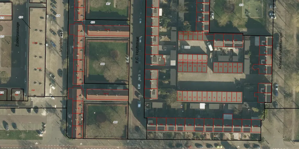 Het perceel waarop P.C. Hooftstraat 5 staat heeft een oppervlakte van 1,6 ha. Dit is een zeer groot perceel. De perceeloppervlakte wordt geregistreerd door het Kadaster. Gedetailleerde informatie over de maten van dit perceel kunt u vinden in het rapport Kadastrale kaart met maatvoering van P.C. Hooftstraat 5.
