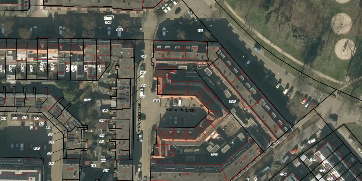 Het perceel waarop Rietpolderplein 2 staat heeft een oppervlakte van 2255 m². Dit is een zeer groot perceel. De perceeloppervlakte wordt geregistreerd door het Kadaster. Gedetailleerde informatie over de maten van dit perceel kunt u vinden in het rapport Kadastrale kaart met maatvoering van Rietpolderplein 2.