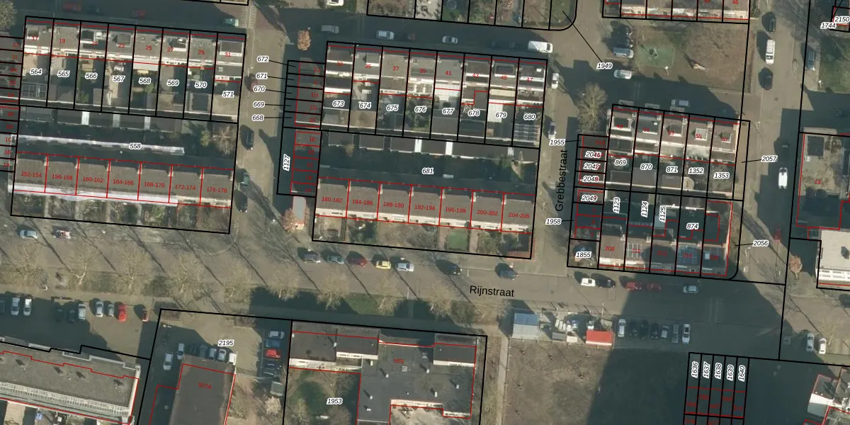 Het perceel waarop Rijnstraat 192 staat heeft een oppervlakte van 1338 m². Dit is een zeer groot perceel. De perceeloppervlakte wordt geregistreerd door het Kadaster. Gedetailleerde informatie over de maten van dit perceel kunt u vinden in het rapport Kadastrale kaart met maatvoering van Rijnstraat 192.