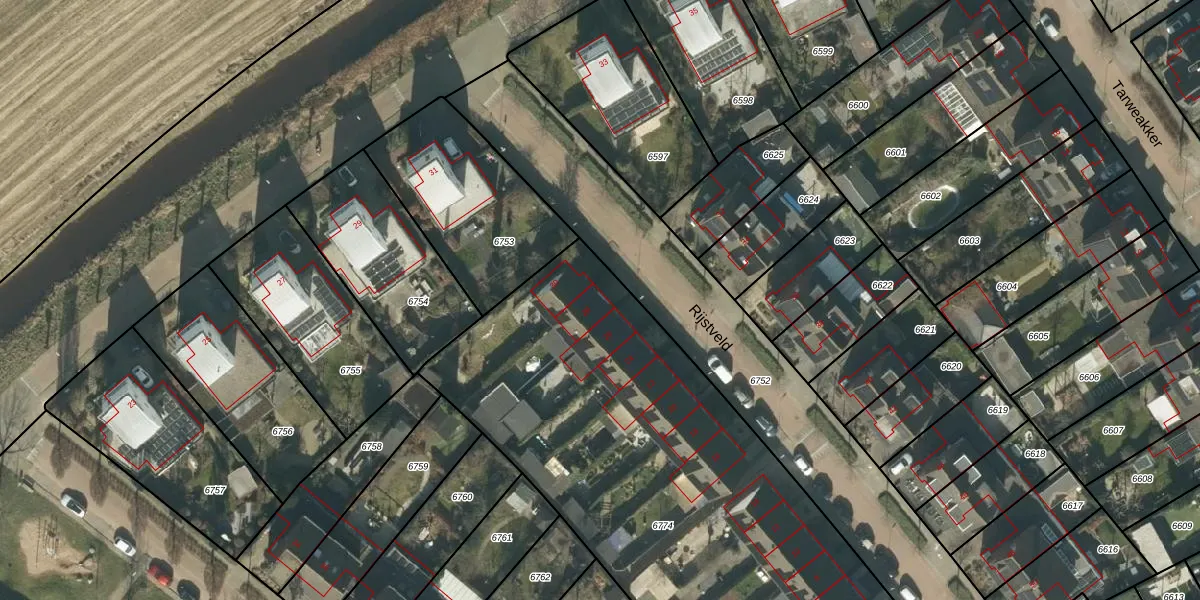 Het perceel waarop Rijstveld 28 staat heeft een oppervlakte van 3059 m². Dit is een zeer groot perceel. De perceeloppervlakte wordt geregistreerd door het Kadaster. Gedetailleerde informatie over de maten van dit perceel kunt u vinden in het rapport Kadastrale kaart met maatvoering van Rijstveld 28.