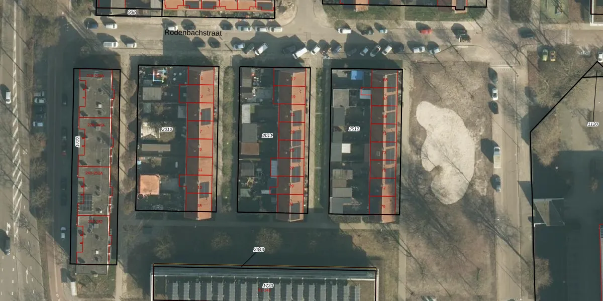 Het perceel waarop Rodenbachstraat 25 staat heeft een oppervlakte van 1140 m². Dit is een zeer groot perceel. De perceeloppervlakte wordt geregistreerd door het Kadaster. Gedetailleerde informatie over de maten van dit perceel kunt u vinden in het rapport Kadastrale kaart met maatvoering van Rodenbachstraat 25.