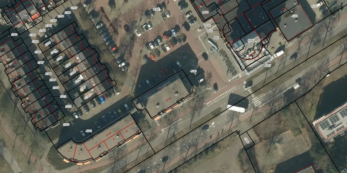 Het perceel waarop Rompertcentrum 2-B staat heeft een oppervlakte van 469 m². Dit is een groot perceel. De perceeloppervlakte wordt geregistreerd door het Kadaster. Gedetailleerde informatie over de maten van dit perceel kunt u vinden in het rapport Kadastrale kaart met maatvoering van Rompertcentrum 2-B.
