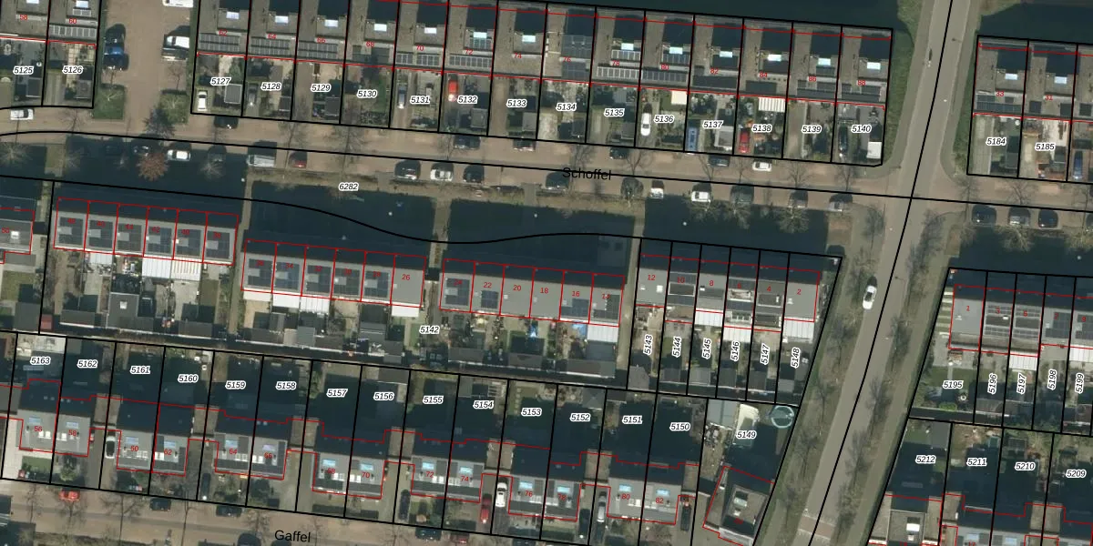 Het perceel waarop Schoffel 18 staat heeft een oppervlakte van 2906 m². Dit is een zeer groot perceel. De perceeloppervlakte wordt geregistreerd door het Kadaster. Gedetailleerde informatie over de maten van dit perceel kunt u vinden in het rapport Kadastrale kaart met maatvoering van Schoffel 18.