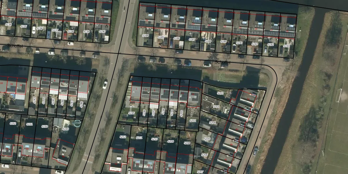 Het perceel waarop Schoffel 9 staat heeft een oppervlakte van 156 m². Dit is een middelgroot perceel. De perceeloppervlakte wordt geregistreerd door het Kadaster. Gedetailleerde informatie over de maten van dit perceel kunt u vinden in het rapport Kadastrale kaart met maatvoering van Schoffel 9.