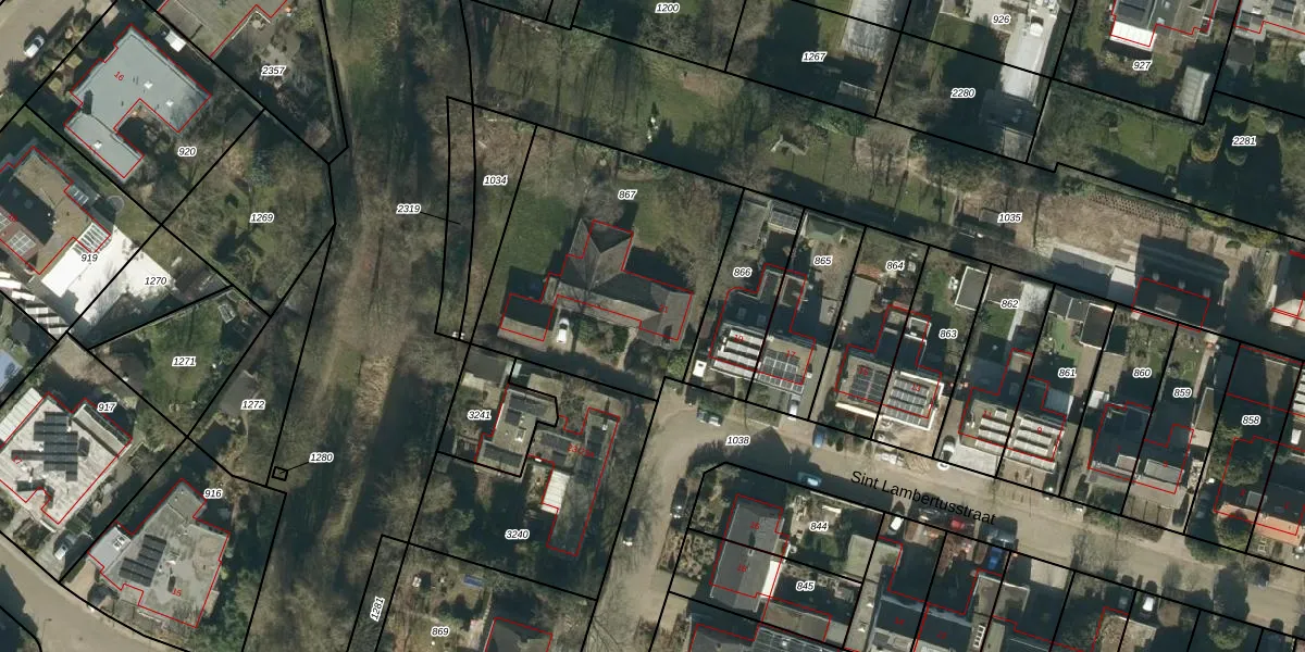 Het perceel waarop Sint Lambertusstraat 21 staat heeft een oppervlakte van 1150 m². Dit is een zeer groot perceel. De perceeloppervlakte wordt geregistreerd door het Kadaster. Gedetailleerde informatie over de maten van dit perceel kunt u vinden in het rapport Kadastrale kaart met maatvoering van Sint Lambertusstraat 21.