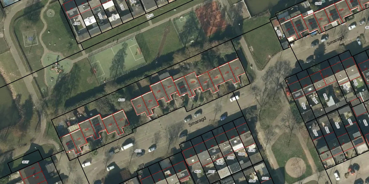 Het perceel waarop Smaragd 162 staat heeft een oppervlakte van 2615 m². Dit is een zeer groot perceel. De perceeloppervlakte wordt geregistreerd door het Kadaster. Gedetailleerde informatie over de maten van dit perceel kunt u vinden in het rapport Kadastrale kaart met maatvoering van Smaragd 162.