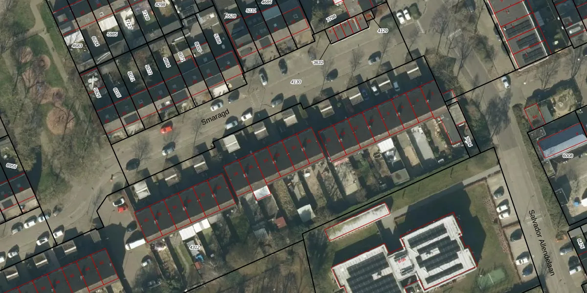 Het perceel waarop Smaragd 20 staat heeft een oppervlakte van 8780 m². Dit is een zeer groot perceel. De perceeloppervlakte wordt geregistreerd door het Kadaster. Gedetailleerde informatie over de maten van dit perceel kunt u vinden in het rapport Kadastrale kaart met maatvoering van Smaragd 20.