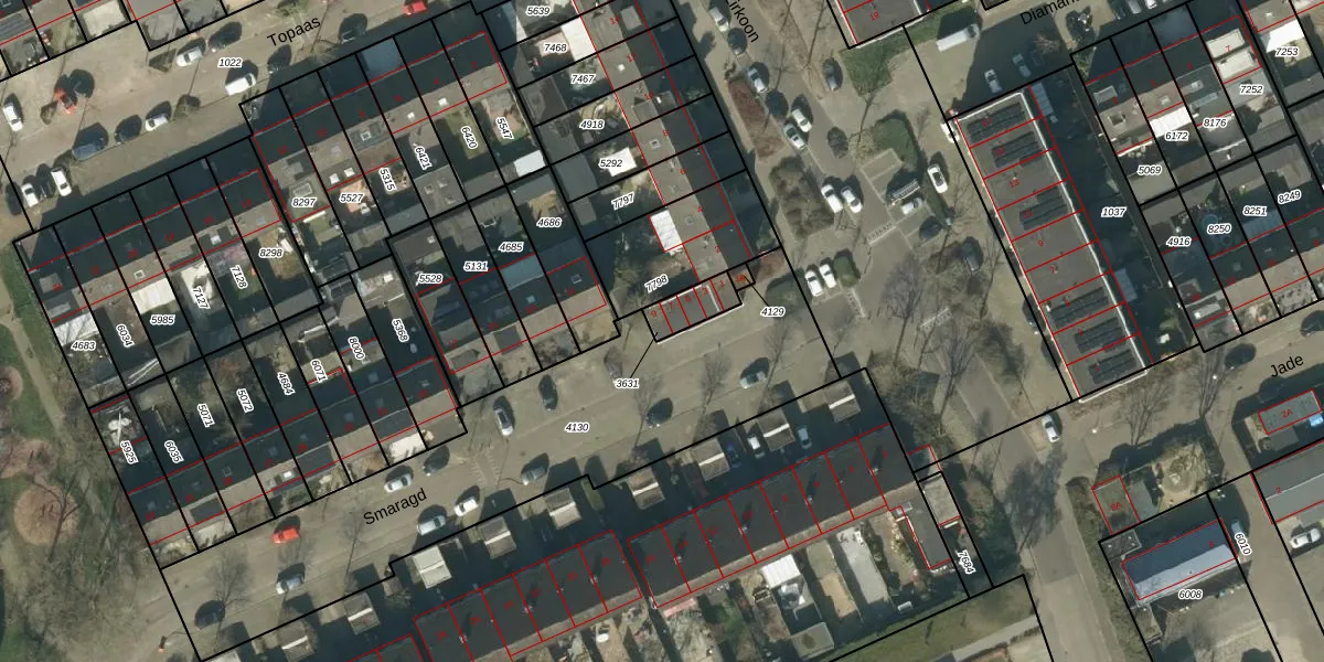 Het perceel waarop Smaragd 9 staat heeft een oppervlakte van 77 m². Dit is een klein perceel. De perceeloppervlakte wordt geregistreerd door het Kadaster. Gedetailleerde informatie over de maten van dit perceel kunt u vinden in het rapport Kadastrale kaart met maatvoering van Smaragd 9.