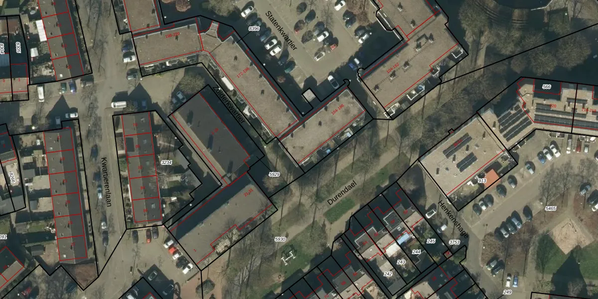Het perceel waarop Statenkwartier 186 staat heeft een oppervlakte van 2255 m². Dit is een zeer groot perceel. De perceeloppervlakte wordt geregistreerd door het Kadaster. Gedetailleerde informatie over de maten van dit perceel kunt u vinden in het rapport Kadastrale kaart met maatvoering van Statenkwartier 186.