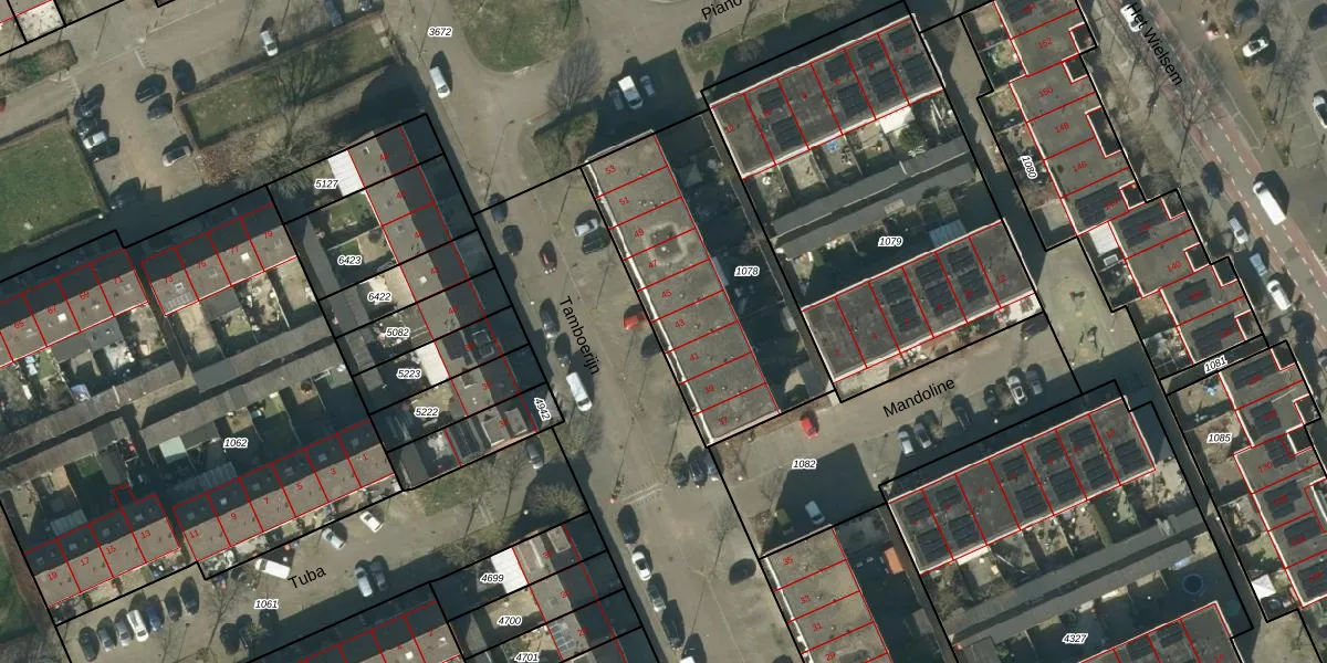 Het perceel waarop Tamboerijn 43 staat heeft een oppervlakte van 995 m². Dit is een groot perceel. De perceeloppervlakte wordt geregistreerd door het Kadaster. Gedetailleerde informatie over de maten van dit perceel kunt u vinden in het rapport Kadastrale kaart met maatvoering van Tamboerijn 43.