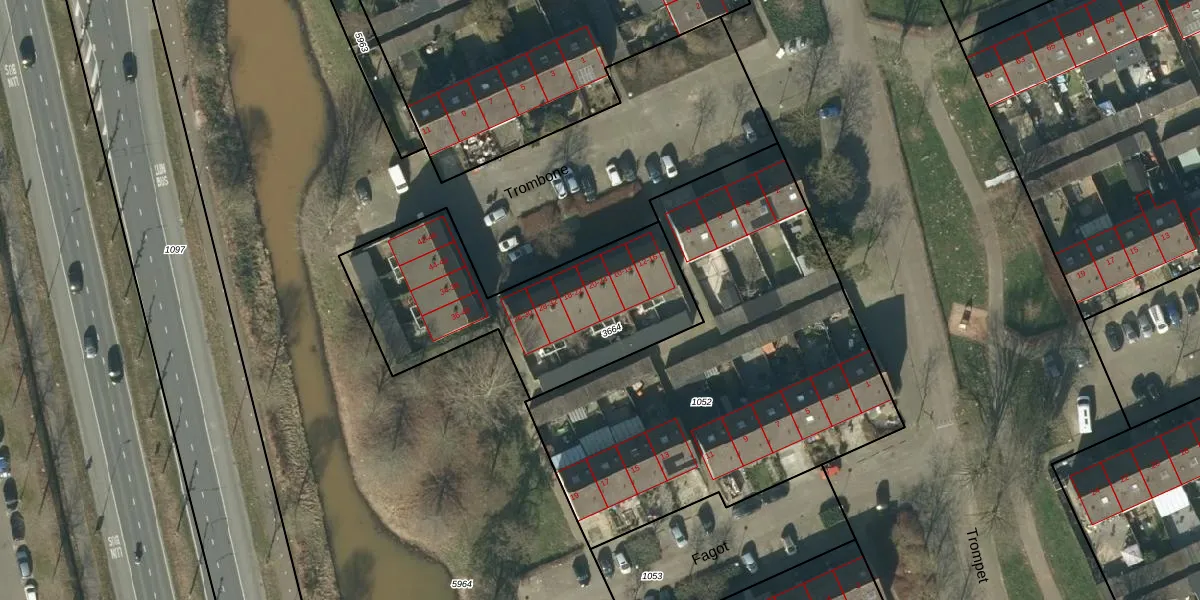 Het perceel waarop Trombone 20 staat heeft een oppervlakte van 1013 m². Dit is een zeer groot perceel. De perceeloppervlakte wordt geregistreerd door het Kadaster. Gedetailleerde informatie over de maten van dit perceel kunt u vinden in het rapport Kadastrale kaart met maatvoering van Trombone 20.