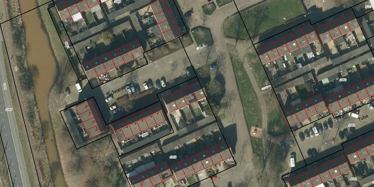 Het perceel waarop Trombone 4-A staat heeft een oppervlakte van 2110 m². Dit is een zeer groot perceel. De perceeloppervlakte wordt geregistreerd door het Kadaster. Gedetailleerde informatie over de maten van dit perceel kunt u vinden in het rapport Kadastrale kaart met maatvoering van Trombone 4-A.
