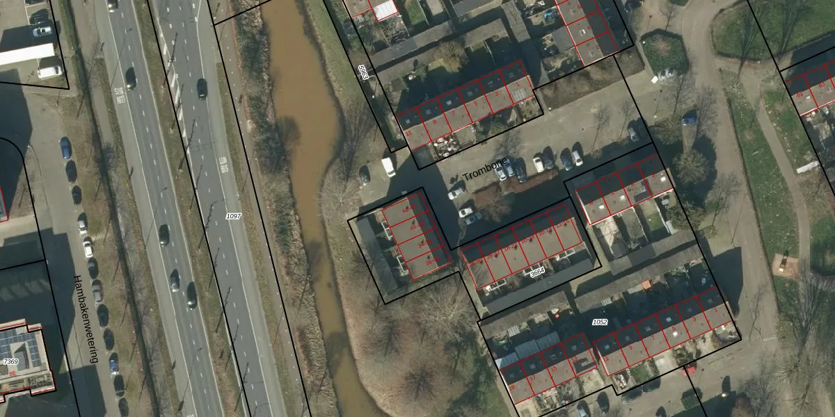 Het perceel waarop Trombone 46 staat heeft een oppervlakte van 1013 m². Dit is een zeer groot perceel. De perceeloppervlakte wordt geregistreerd door het Kadaster. Gedetailleerde informatie over de maten van dit perceel kunt u vinden in het rapport Kadastrale kaart met maatvoering van Trombone 46.
