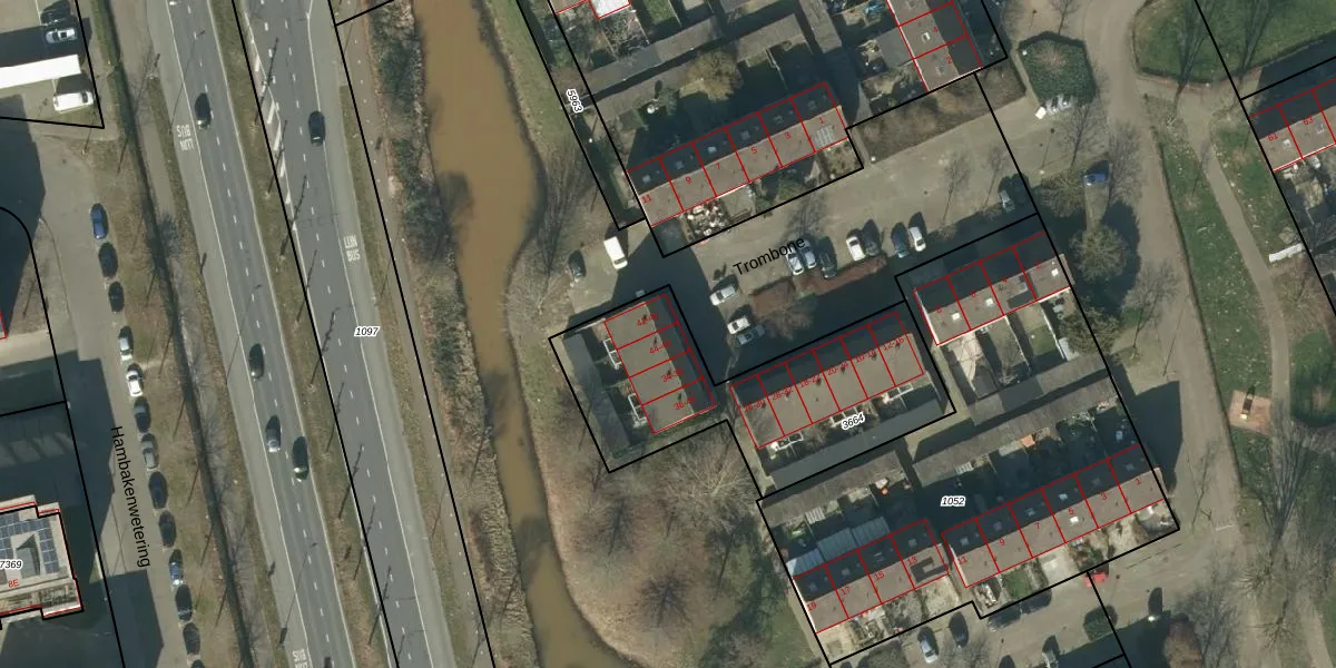 Het perceel waarop Trombone 48 staat heeft een oppervlakte van 1013 m². Dit is een zeer groot perceel. De perceeloppervlakte wordt geregistreerd door het Kadaster. Gedetailleerde informatie over de maten van dit perceel kunt u vinden in het rapport Kadastrale kaart met maatvoering van Trombone 48.