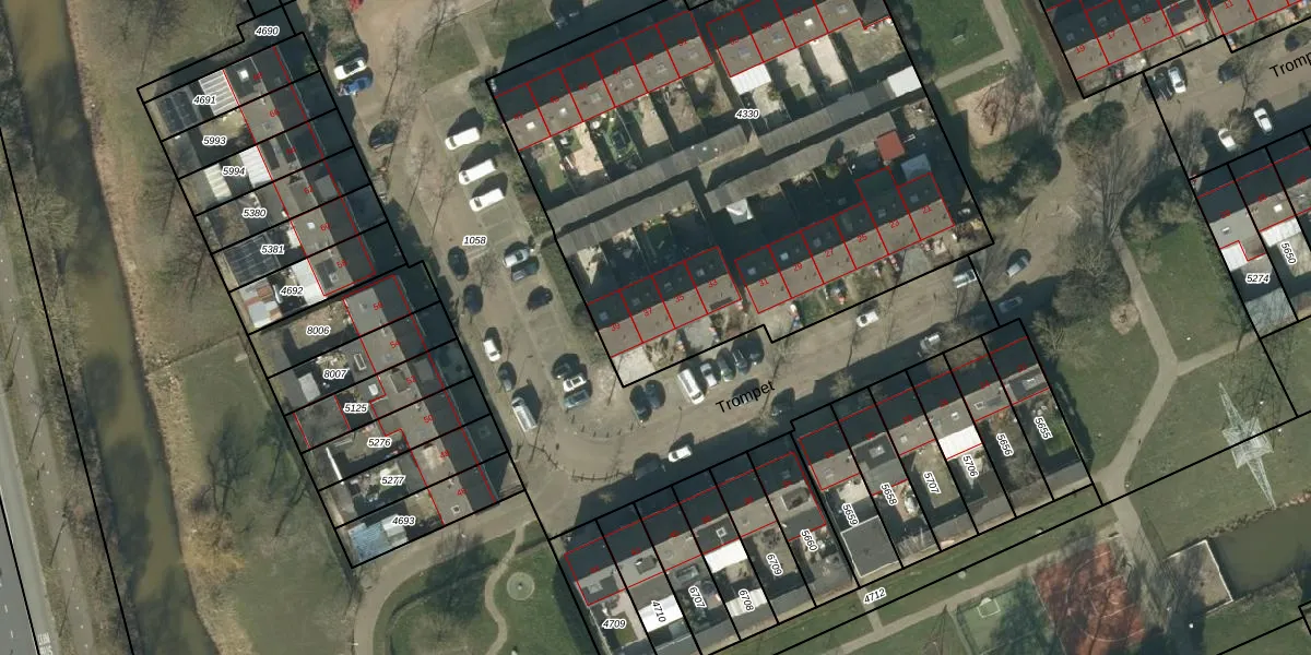 Het perceel waarop Trompet 37 staat heeft een oppervlakte van 3157 m². Dit is een zeer groot perceel. De perceeloppervlakte wordt geregistreerd door het Kadaster. Gedetailleerde informatie over de maten van dit perceel kunt u vinden in het rapport Kadastrale kaart met maatvoering van Trompet 37.