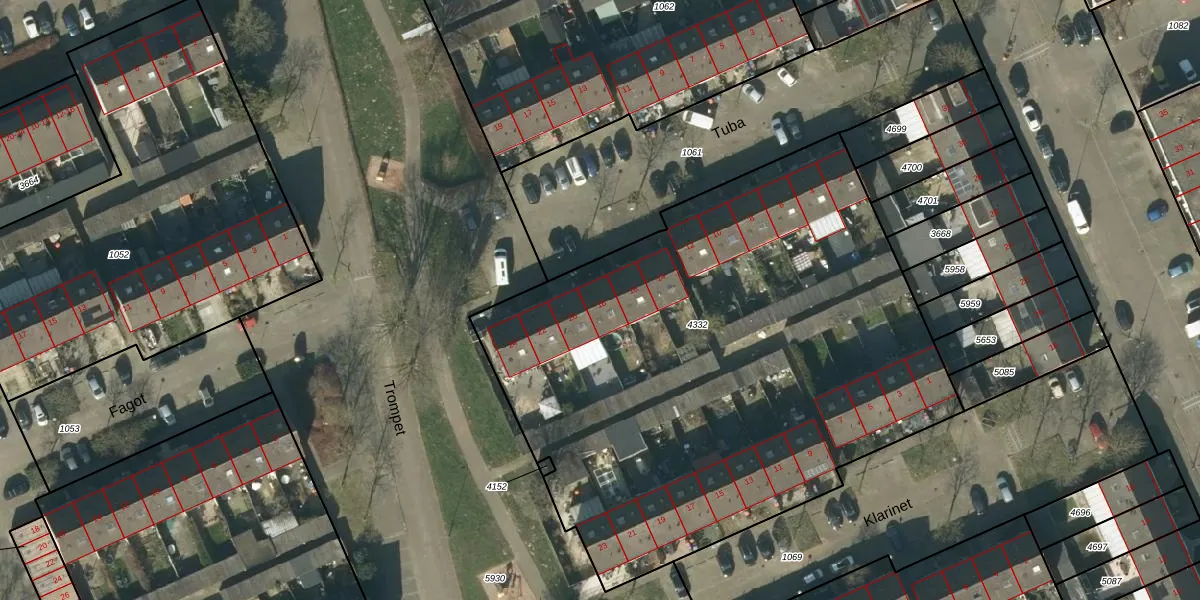 Het perceel waarop Tuba 18 staat heeft een oppervlakte van 3490 m². Dit is een zeer groot perceel. De perceeloppervlakte wordt geregistreerd door het Kadaster. Gedetailleerde informatie over de maten van dit perceel kunt u vinden in het rapport Kadastrale kaart met maatvoering van Tuba 18.