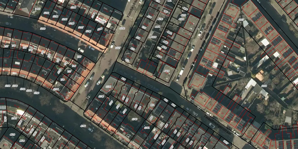 Het perceel waarop Twaalfmorgenstraat 2-A staat heeft een oppervlakte van 1082 m². Dit is een zeer groot perceel. De perceeloppervlakte wordt geregistreerd door het Kadaster. Gedetailleerde informatie over de maten van dit perceel kunt u vinden in het rapport Kadastrale kaart met maatvoering van Twaalfmorgenstraat 2-A.