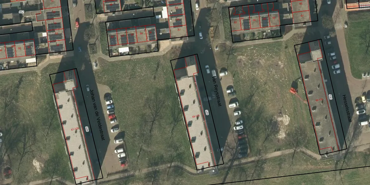 Het perceel waarop van Reysstraat 115 staat heeft een oppervlakte van 906 m². Dit is een groot perceel. De perceeloppervlakte wordt geregistreerd door het Kadaster. Gedetailleerde informatie over de maten van dit perceel kunt u vinden in het rapport Kadastrale kaart met maatvoering van van Reysstraat 115.