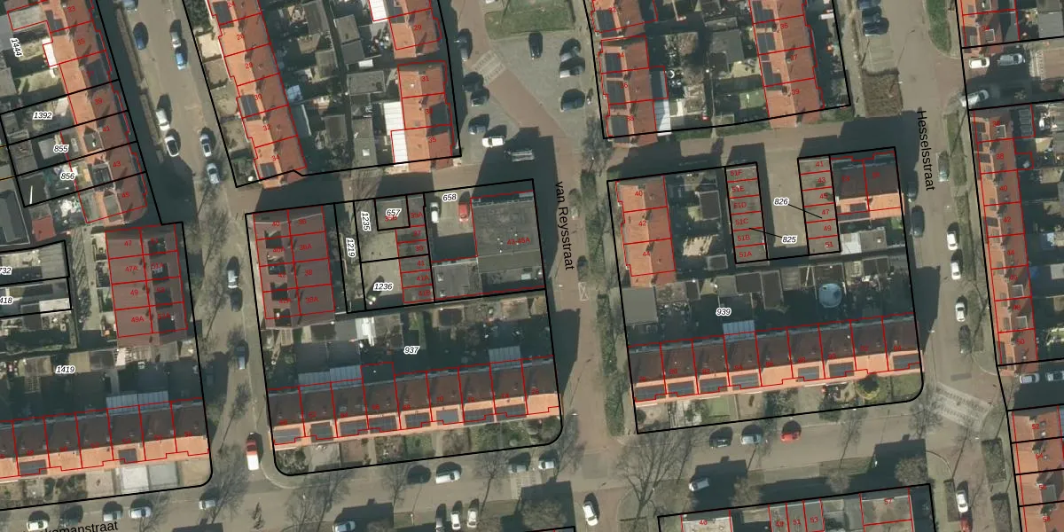 Het perceel waarop van Reysstraat 45-A staat heeft een oppervlakte van 434 m². Dit is een groot perceel. De perceeloppervlakte wordt geregistreerd door het Kadaster. Gedetailleerde informatie over de maten van dit perceel kunt u vinden in het rapport Kadastrale kaart met maatvoering van van Reysstraat 45-A.