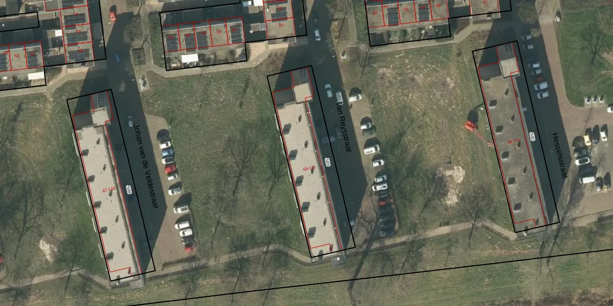 Het perceel waarop van Reysstraat 89 staat heeft een oppervlakte van 906 m². Dit is een groot perceel. De perceeloppervlakte wordt geregistreerd door het Kadaster. Gedetailleerde informatie over de maten van dit perceel kunt u vinden in het rapport Kadastrale kaart met maatvoering van van Reysstraat 89.