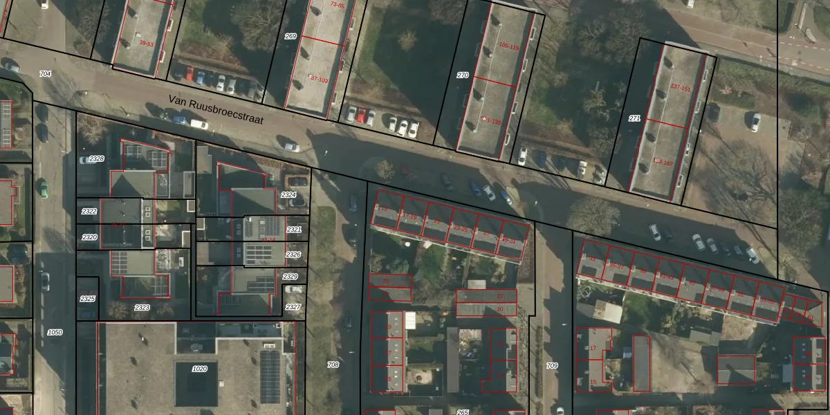 Het perceel waarop Van Ruusbroecstraat 17 staat heeft een oppervlakte van 4320 m². Dit is een zeer groot perceel. De perceeloppervlakte wordt geregistreerd door het Kadaster. Gedetailleerde informatie over de maten van dit perceel kunt u vinden in het rapport Kadastrale kaart met maatvoering van Van Ruusbroecstraat 17.