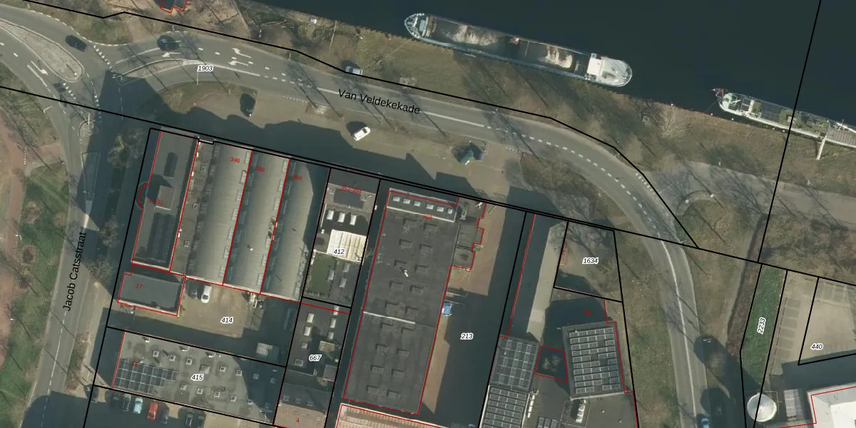 Het perceel waarop Van Veldekekade 358 staat heeft een oppervlakte van 2166 m². Dit is een zeer groot perceel. De perceeloppervlakte wordt geregistreerd door het Kadaster. Gedetailleerde informatie over de maten van dit perceel kunt u vinden in het rapport Kadastrale kaart met maatvoering van Van Veldekekade 358.
