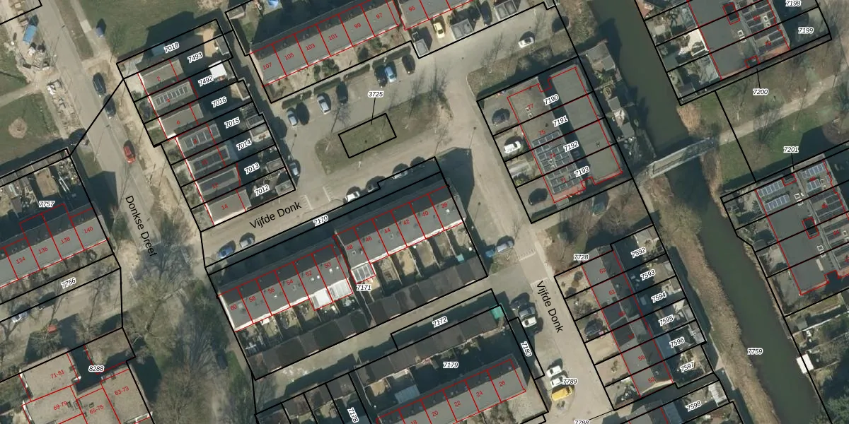 Het perceel waarop Vijfde Donk 40 staat heeft een oppervlakte van 1615 m². Dit is een zeer groot perceel. De perceeloppervlakte wordt geregistreerd door het Kadaster. Gedetailleerde informatie over de maten van dit perceel kunt u vinden in het rapport Kadastrale kaart met maatvoering van Vijfde Donk 40.