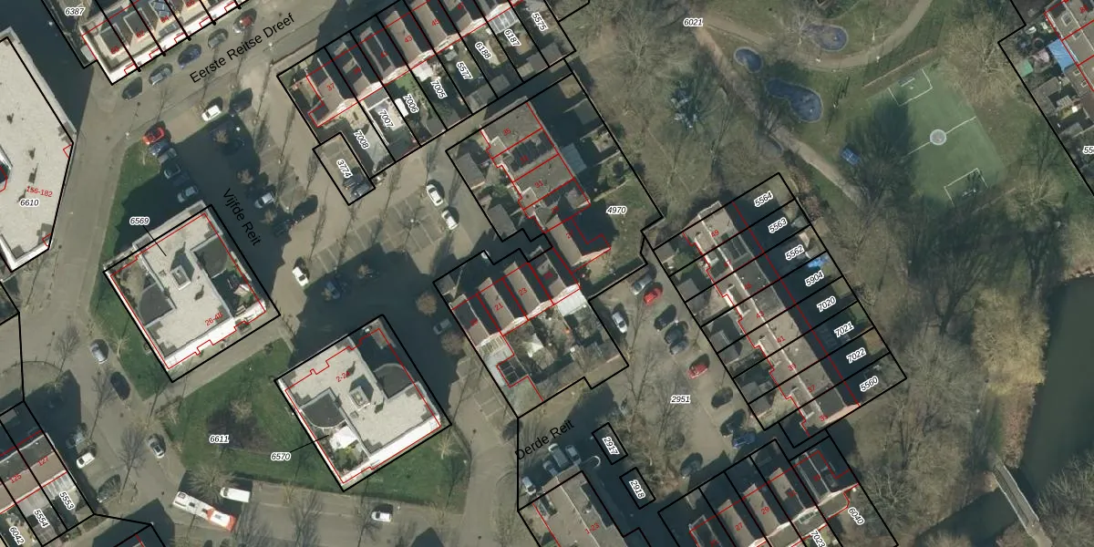 Het perceel waarop Vijfde Reit 25 staat heeft een oppervlakte van 1469 m². Dit is een zeer groot perceel. De perceeloppervlakte wordt geregistreerd door het Kadaster. Gedetailleerde informatie over de maten van dit perceel kunt u vinden in het rapport Kadastrale kaart met maatvoering van Vijfde Reit 25.