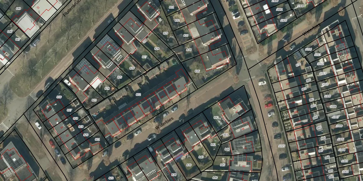 Het perceel waarop Waterbies 18 staat heeft een oppervlakte van 1327 m². Dit is een zeer groot perceel. De perceeloppervlakte wordt geregistreerd door het Kadaster. Gedetailleerde informatie over de maten van dit perceel kunt u vinden in het rapport Kadastrale kaart met maatvoering van Waterbies 18.