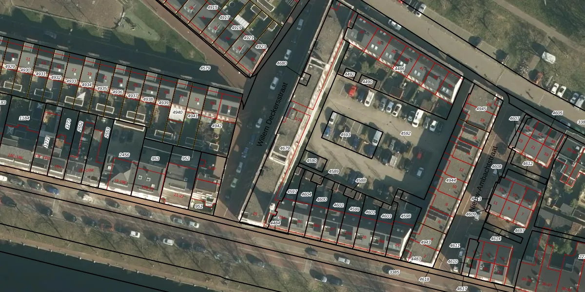 Het perceel waarop Willem Deckersstraat 19 staat heeft een oppervlakte van 845 m². Dit is een groot perceel. De perceeloppervlakte wordt geregistreerd door het Kadaster. Gedetailleerde informatie over de maten van dit perceel kunt u vinden in het rapport Kadastrale kaart met maatvoering van Willem Deckersstraat 19.