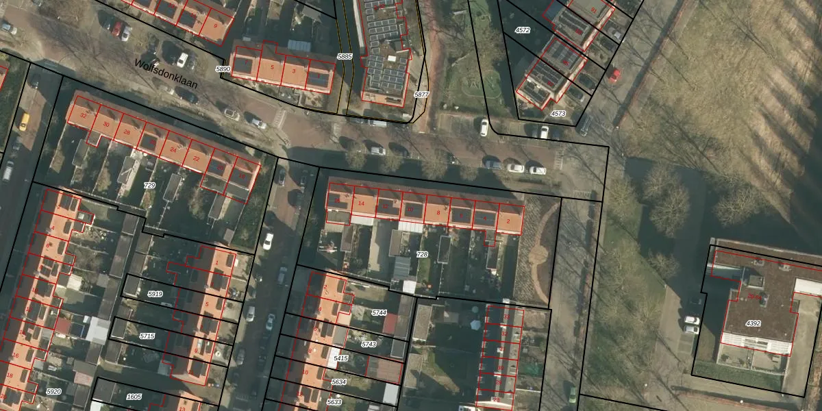 Het perceel waarop Wolfsdonklaan 10 staat heeft een oppervlakte van 1655 m². Dit is een zeer groot perceel. De perceeloppervlakte wordt geregistreerd door het Kadaster. Gedetailleerde informatie over de maten van dit perceel kunt u vinden in het rapport Kadastrale kaart met maatvoering van Wolfsdonklaan 10.