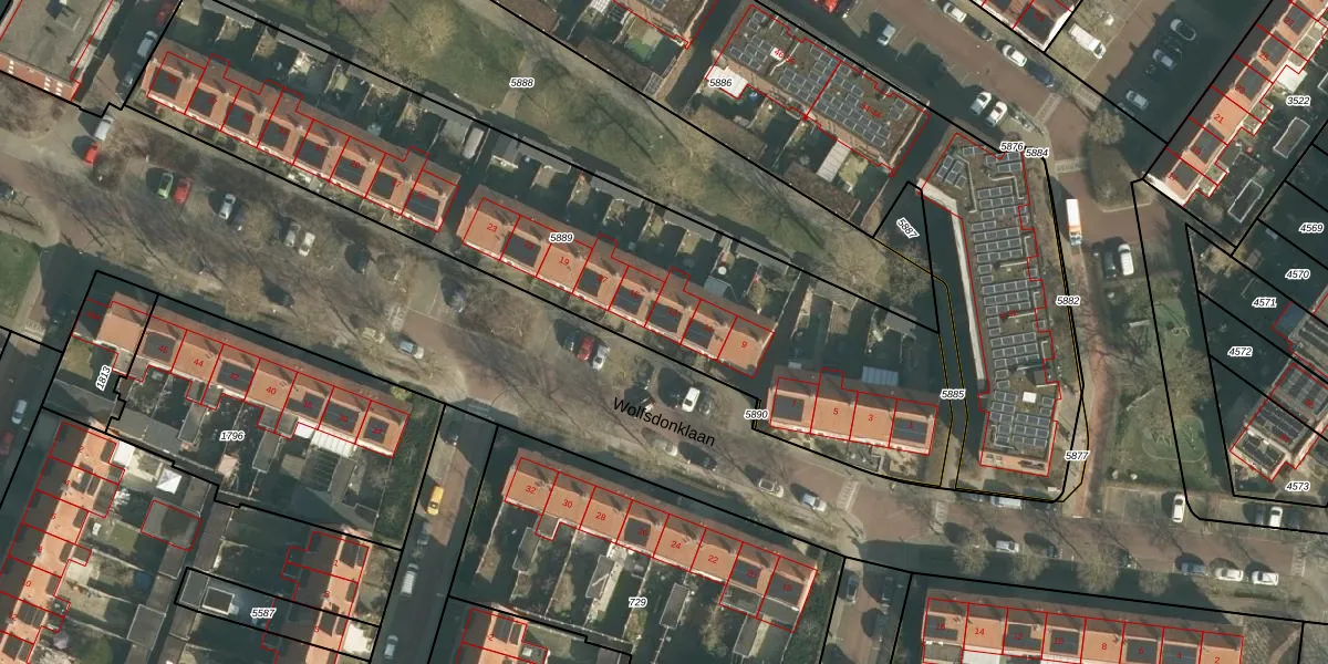 Wolfsdonklaan 13 is gelegen op kadastraal perceel HTG00K5889. Deze kadastrale aanduiding is uniek en wordt gebruikt door het Kadaster om eigendomsrechten en andere zakelijke rechten vast te leggen. Het perceel maakt onderdeel uit van de kadastrale gemeente 's-Hertogenbosch.
