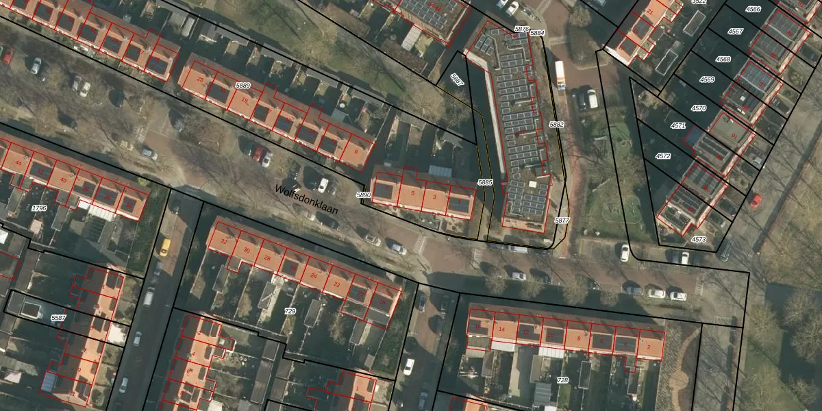 Wolfsdonklaan 5 is gelegen op kadastraal perceel HTG00K5889. Deze kadastrale aanduiding is uniek en wordt gebruikt door het Kadaster om eigendomsrechten en andere zakelijke rechten vast te leggen. Het perceel maakt onderdeel uit van de kadastrale gemeente 's-Hertogenbosch.