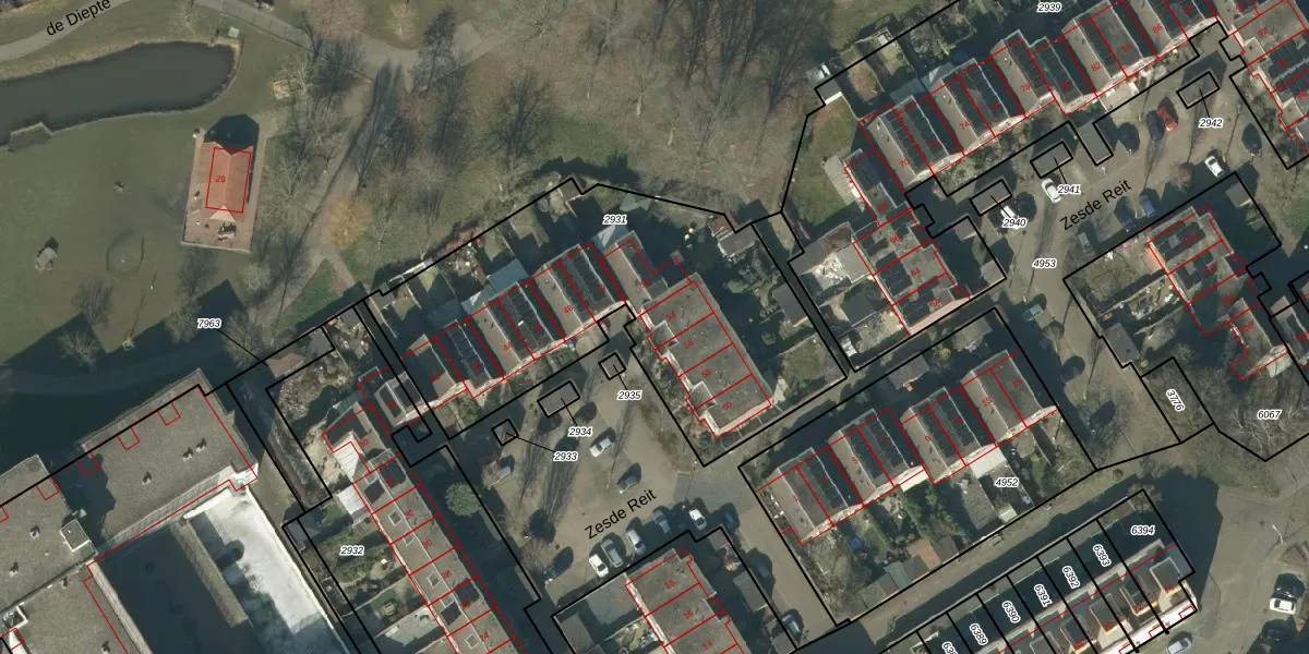 Het perceel waarop Zesde Reit 54 staat heeft een oppervlakte van 1738 m². Dit is een zeer groot perceel. De perceeloppervlakte wordt geregistreerd door het Kadaster. Gedetailleerde informatie over de maten van dit perceel kunt u vinden in het rapport Kadastrale kaart met maatvoering van Zesde Reit 54.