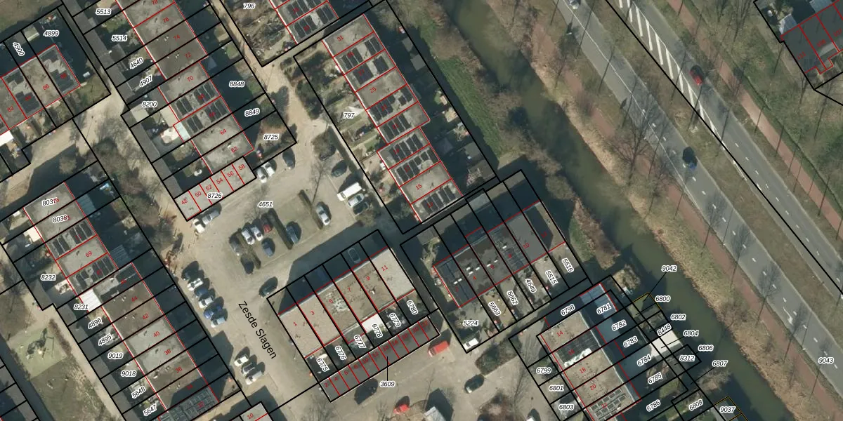 Het perceel waarop Zesde Slagen 13 staat heeft een oppervlakte van 1291 m². Dit is een zeer groot perceel. De perceeloppervlakte wordt geregistreerd door het Kadaster. Gedetailleerde informatie over de maten van dit perceel kunt u vinden in het rapport Kadastrale kaart met maatvoering van Zesde Slagen 13.