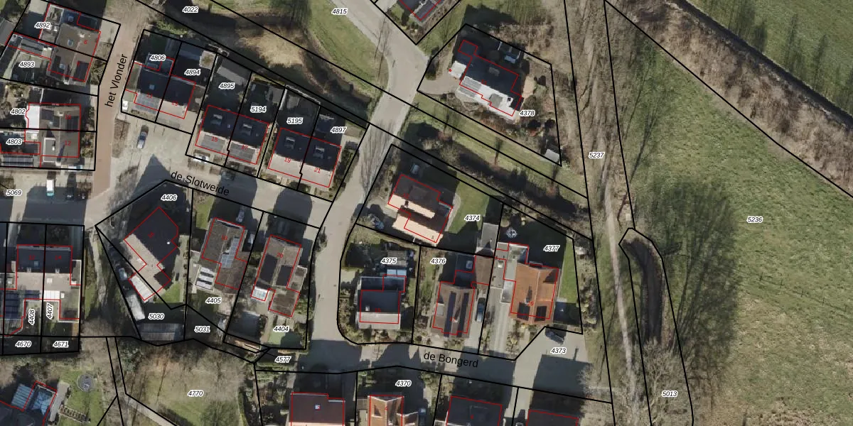 Het perceel waarop de Bongerd 13 staat heeft een oppervlakte van 539 m². Dit is een groot perceel. De perceeloppervlakte wordt geregistreerd door het Kadaster. Gedetailleerde informatie over de maten van dit perceel kunt u vinden in het rapport Kadastrale kaart met maatvoering van de Bongerd 13.