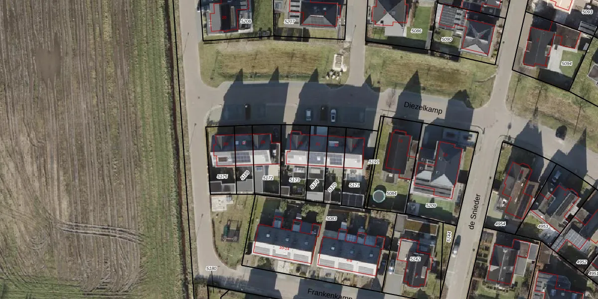 Het perceel waarop Diezelkamp 23 staat heeft een oppervlakte van 227 m². Dit is een middelgroot perceel. De perceeloppervlakte wordt geregistreerd door het Kadaster. Gedetailleerde informatie over de maten van dit perceel kunt u vinden in het rapport Kadastrale kaart met maatvoering van Diezelkamp 23.