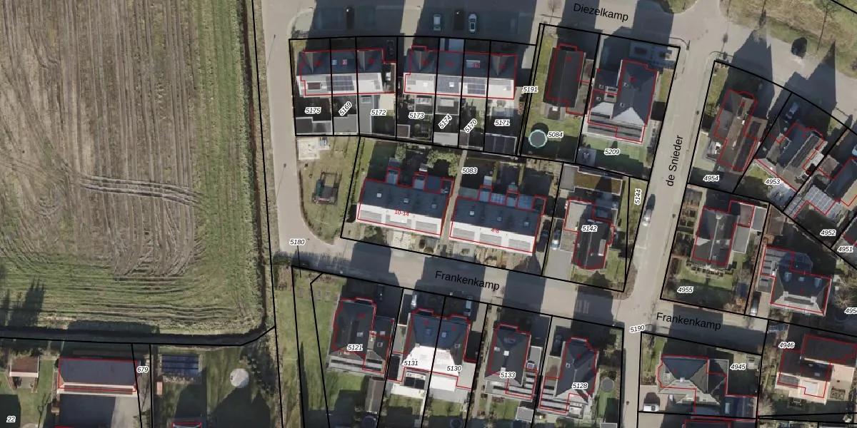 Het perceel waarop Frankenkamp 10 staat heeft een oppervlakte van 1226 m². Dit is een zeer groot perceel. De perceeloppervlakte wordt geregistreerd door het Kadaster. Gedetailleerde informatie over de maten van dit perceel kunt u vinden in het rapport Kadastrale kaart met maatvoering van Frankenkamp 10.