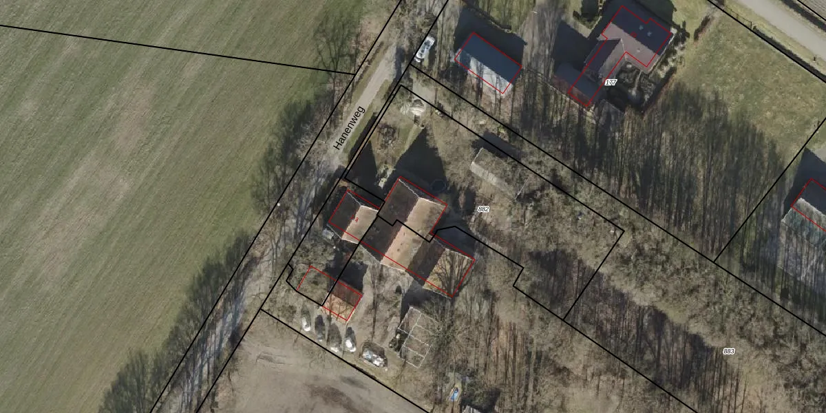 Hanenweg 1-A is gelegen op kadastraal perceel WSL02V882. Deze kadastrale aanduiding is uniek en wordt gebruikt door het Kadaster om eigendomsrechten en andere zakelijke rechten vast te leggen. Het perceel maakt onderdeel uit van de kadastrale gemeente Weerselo.