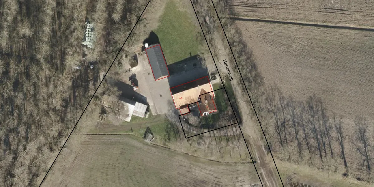Het perceel waarop Hanenweg 4-A staat heeft een oppervlakte van 1,6 ha. Dit is een zeer groot perceel. De perceeloppervlakte wordt geregistreerd door het Kadaster. Gedetailleerde informatie over de maten van dit perceel kunt u vinden in het rapport Kadastrale kaart met maatvoering van Hanenweg 4-A.
