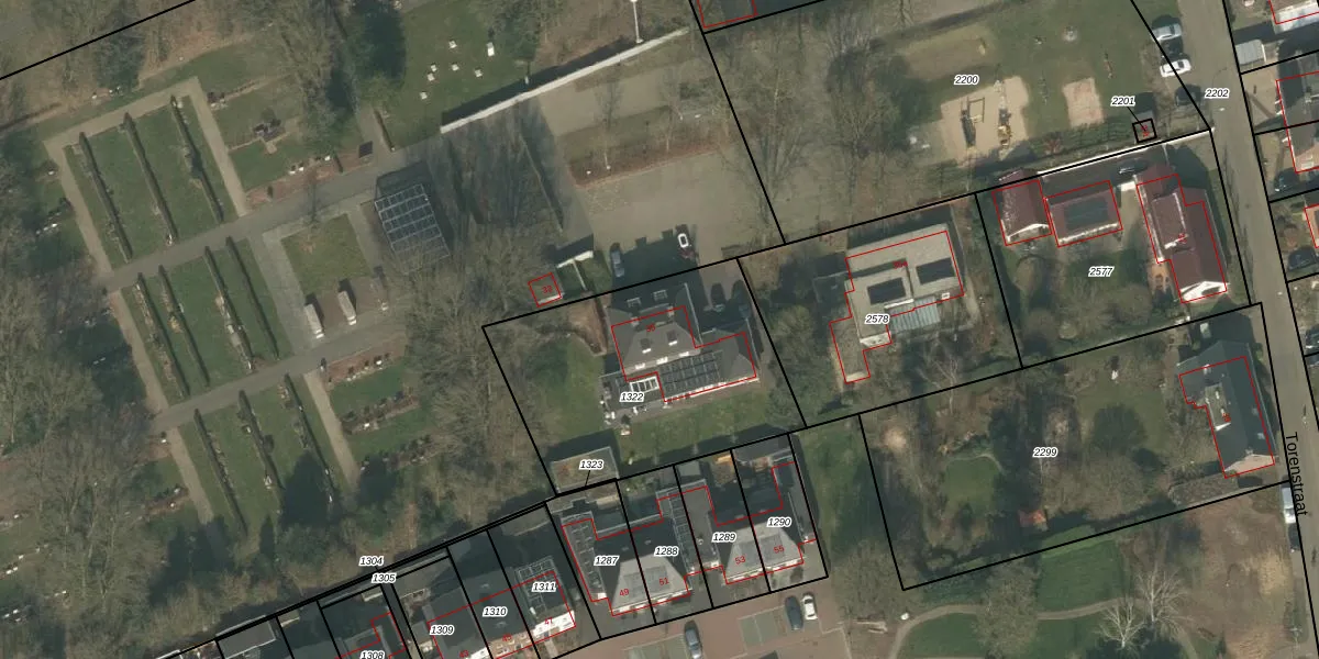 Het perceel waarop Torenstraat 35 staat heeft een oppervlakte van 1116 m². Dit is een zeer groot perceel. De perceeloppervlakte wordt geregistreerd door het Kadaster. Gedetailleerde informatie over de maten van dit perceel kunt u vinden in het rapport Kadastrale kaart met maatvoering van Torenstraat 35.