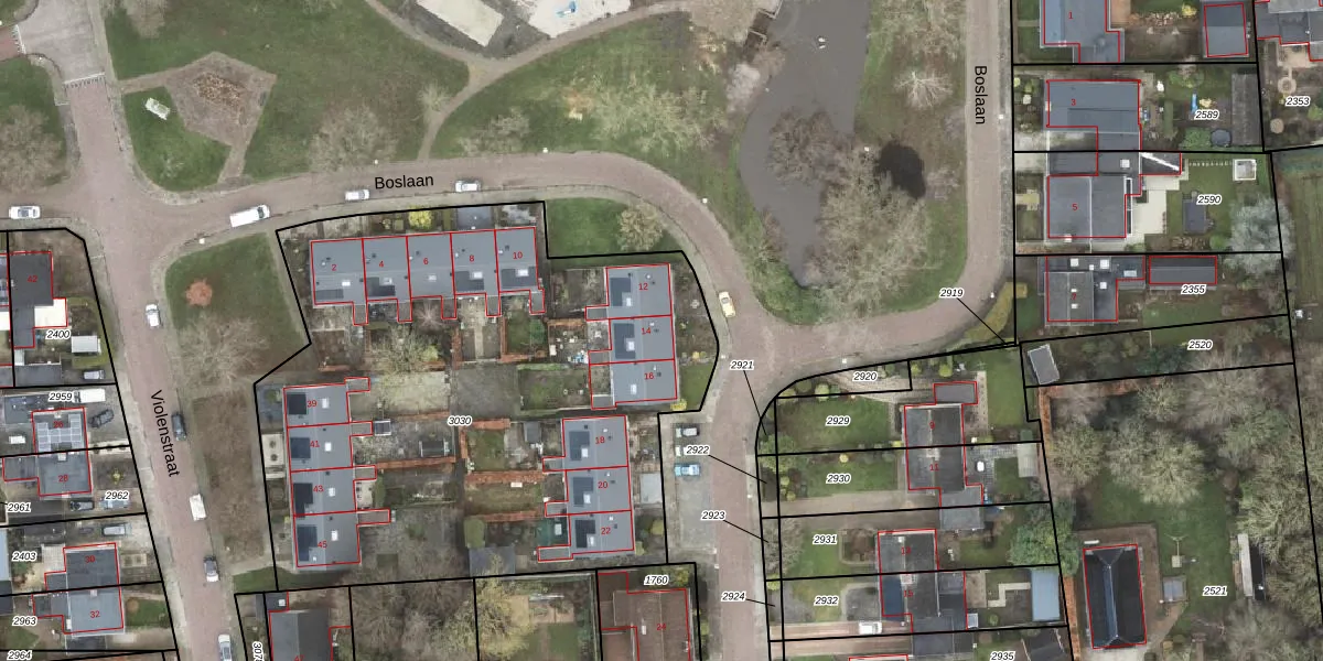 Het perceel waarop Boslaan 14 staat heeft een oppervlakte van 3262 m². Dit is een zeer groot perceel. De perceeloppervlakte wordt geregistreerd door het Kadaster. Gedetailleerde informatie over de maten van dit perceel kunt u vinden in het rapport Kadastrale kaart met maatvoering van Boslaan 14.