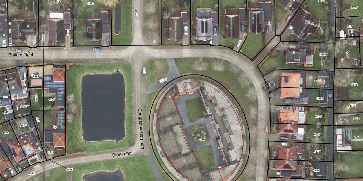 Het perceel waarop Compagniesterpoort 21-a staat heeft een oppervlakte van 2822 m². Dit is een zeer groot perceel. De perceeloppervlakte wordt geregistreerd door het Kadaster. Gedetailleerde informatie over de maten van dit perceel kunt u vinden in het rapport Kadastrale kaart met maatvoering van Compagniesterpoort 21-a.
