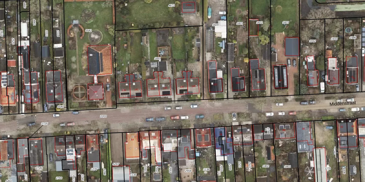 Het perceel waarop Middenstraat 147 staat heeft een oppervlakte van 1921 m². Dit is een zeer groot perceel. De perceeloppervlakte wordt geregistreerd door het Kadaster. Gedetailleerde informatie over de maten van dit perceel kunt u vinden in het rapport Kadastrale kaart met maatvoering van Middenstraat 147.